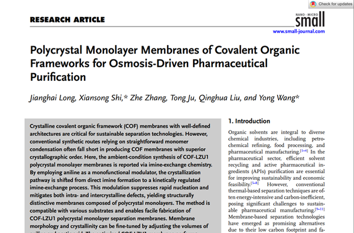 Polycrystal Monolayer Membranes of Covalent Organic Frameworks for Osmosis-Driven Pharmaceutical Puri?cation