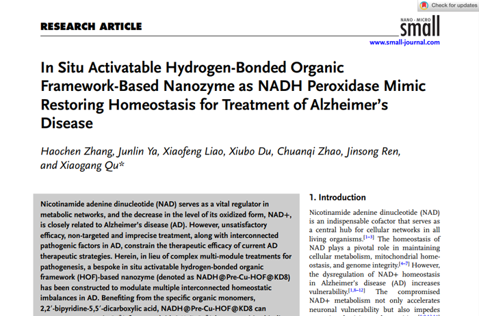 In Situ Activatable Hydrogen-Bonded Organic Framework-Based Nanozyme as NADH Peroxidase Mimic Restoring Homeostasis for Treatment of Alzheimer’s Disease