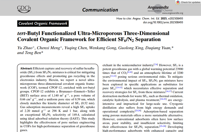 tert-Butyl Functionalized Ultra-Microporous Three-Dimensional Covalent Organic Framework for Ef?cient SF6/N2Separation