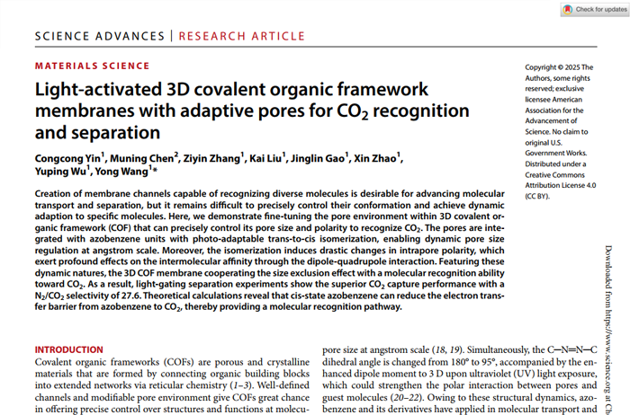 Light-activated 3D covalent organic framework membranes with adaptive pores for CO2recognitionand separation